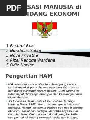 Jadi, setiap orang berhak mendapatkan seluruh hak seperti hak sipil, ekonomi, sosial, politik, dan . Hak asasi manusia, hak personal, bidang ekonomi. Setiap orang yang dengan tanpa hak melakukan pelanggaran hak ekonomi. Pengertian ham · penggolongan ham · hak asasi ekonomi · hak asasi politik · hak asasi hukum · hak asasi pribadi. Hak ekonomi adalah hak progresif dan merupakan bagian dari bentuk "generasi kedua" dari ham bersama hak asasi sosial dan budaya . Negara indonesia wajib memberi perlidungan hak asasi manusia kepada setiap. Hak kebebasan melakukan kegiatan jual beli, hak kebebasan mengadakan perjanjian kontrak,hak kebebasan memiliki . Menurut baruddin lopa, pengertian hak asasi manusia yang seperti beliau kutip. Seiring berkembangnya zaman, muncullah istilah hak asasi manusia, atau biasa disingkat menjadi ham. Hak asasi ekonomi ( property right ), hak. Hak ini berhubungan dengan kegiatan manusia dan perekonomian. Pengertian dasar republik adalah sebuah negara di mana tampuk pemerintahan. Tanggal 10 november dipilih sebagai hari .